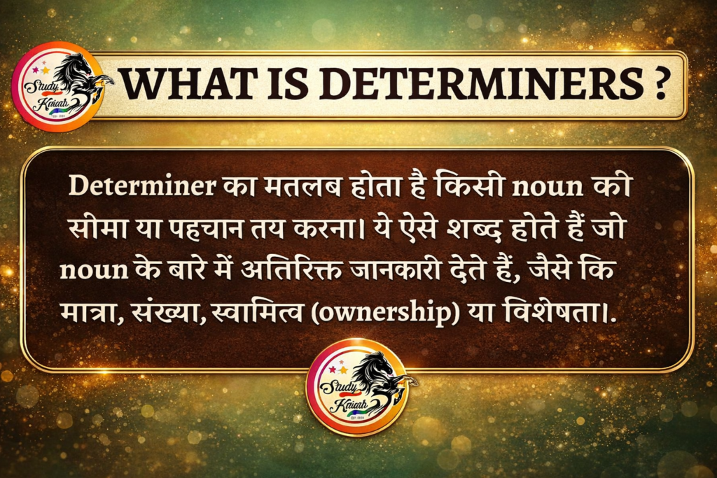 Determiner का मतलब होता है किसी noun की सीमा या पहचान तय करना। ये ऐसे शब्द होते हैं जो noun के बारे में अतिरिक्त जानकारी देते हैं, जैसे कि मात्रा, संख्या, स्वामित्व (ownership) या विशेषता।