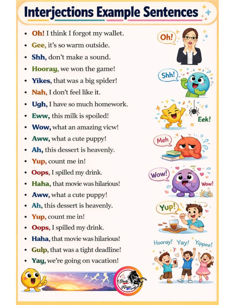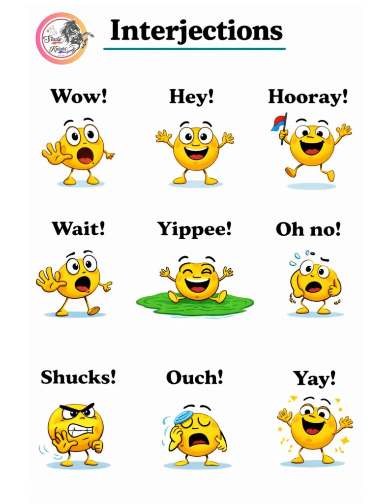 In short, Interjections are expressive words or short phrases that communicate strong emotions or sudden reactions. They add energy and natural expression to language, helping us convey feelings like excitement, surprise, sadness, or relief — from “Wow!” to “Oh dear!”, these small words make communication more lively and meaningful.